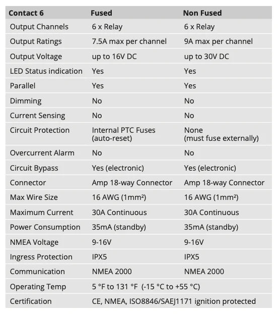 The Contact 6 is a digital control module that can be networked with other CZone products or stand alone. The Contact 6 has six independent dry contact relays that can be used for a wide range of applications, including controlling generators, battery switches, lights and reversing motors (shades, vents, lifts).